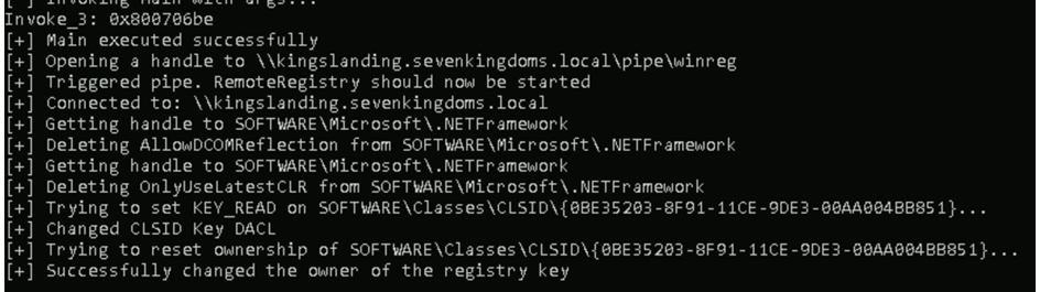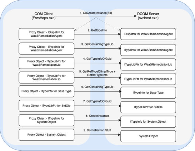 Shifting our attention to focus on remote programmatic aspects, we first used Remote Registry to manipulate the .NetFramework registry key values and hijack the StdFont object on the target machine. Next, we swapped CoCreateInstance for CoCreateInstanceEx to instantiate the WaaSRemediation COM object on the remote target and get a pointer to the IDispatch interface.