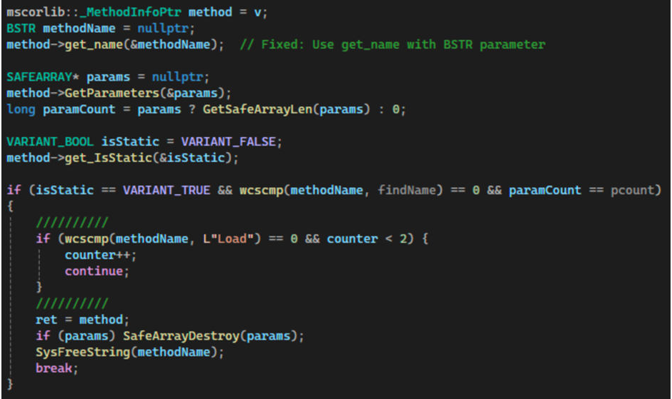 Another issue was finding the proper Assembly.Load overload. Helper functions were taken from Forshaw’s CVE-2014-0257 code, which included the GetStaticMethod function. This function used .NET reflection over DCOM to find a static method given a type pointer, the method name and its parameter count. Assembly.Load has two static overloads that take a single argument; as such, we ended up using a hacky solution. We noticed the third instance of Load with a single argument was our right pick.